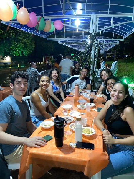 A comida, claro, foi um dos grandes destaques da noite. Preparada com cuidado pelos alunos dos cursos de Nutrição e Engenharia de Alimentos, a gastronomia foi pensada para unir sabor e acolhimento. O cardápio teve como prato principal uma galinhada suculenta acompanhada de creme de milho, farofa e salada. Como sobremesa, o mousse de maracujá e o mousse de chocolate branco agradou a todos os paladares.