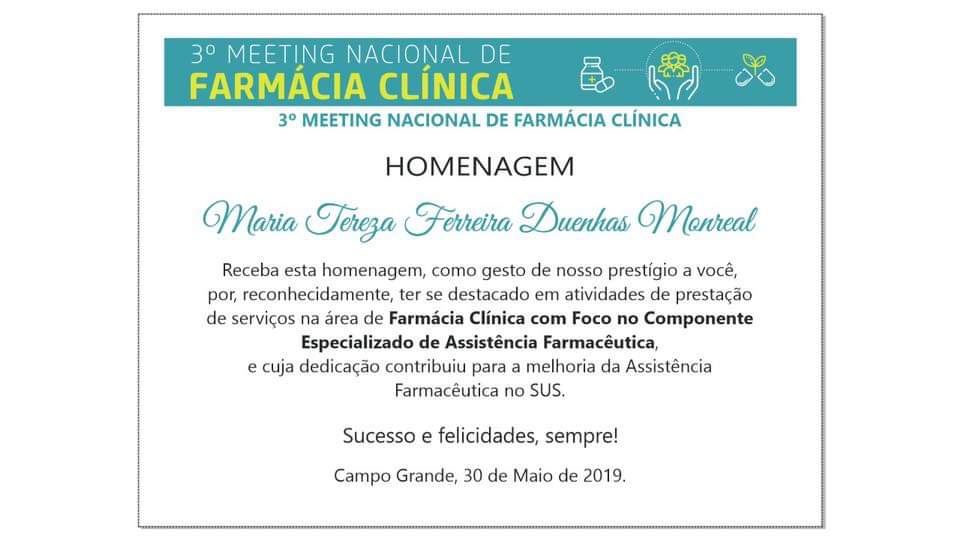 A Professora Maria Tereza Ferreira Duenhas Monreal, docente da FACFAN, foi homenageada no 3º Meeting Nacional de Farmácia Clínica, por ter se destacado em atividades de prestação de serviços na área de Farmácia Clínica com Foco no Componente Especializado de Assistência Farmacêutica.