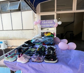 Mesa do Cabide Solidário montada no Agosto Lilás, com doações de roupas e calçados disponíveis ao público