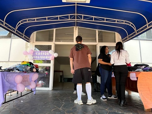 Cabide Solidário no Agosto Lilás com mesas de doações de roupas e calçados organizadas durante o evento