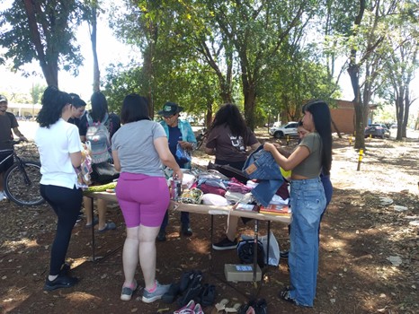 No evento do Setembro Amarelo organizado pelo CEA, acadêmicos conferem as peças disponíveis no Cabide Solidário, com roupas e calçados expostos em mesa de doações