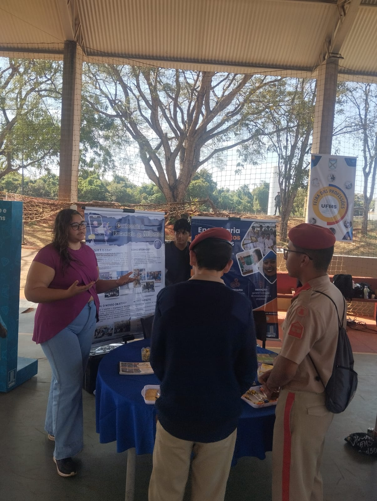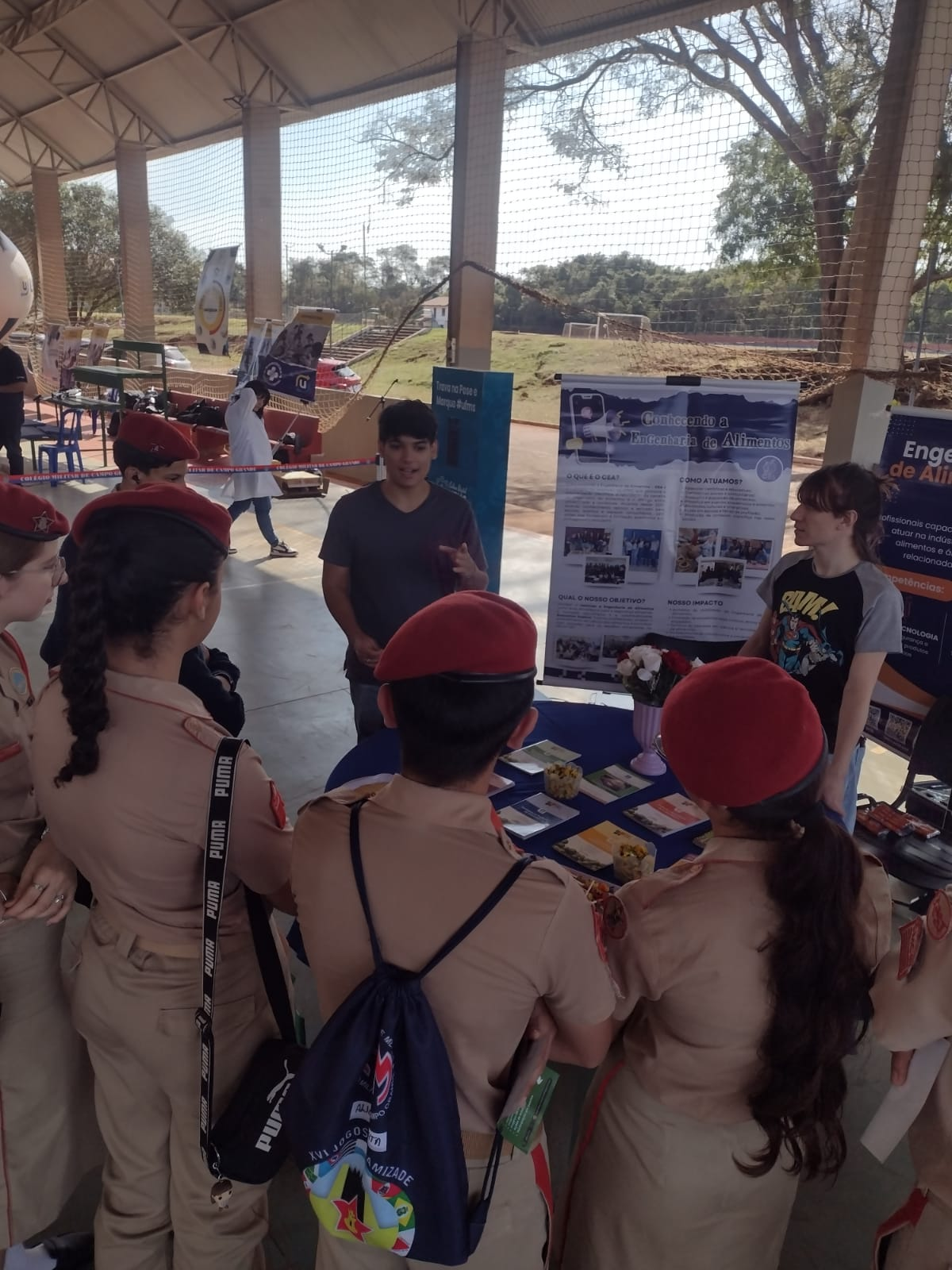 Acadêmicos de Engenharia de Alimentos participaram da Feira de Profissões com o projeto CEA, promovendo diálogos com estudantes do Colégio Militar sobre carreira e formação na área.