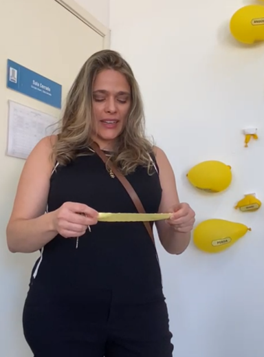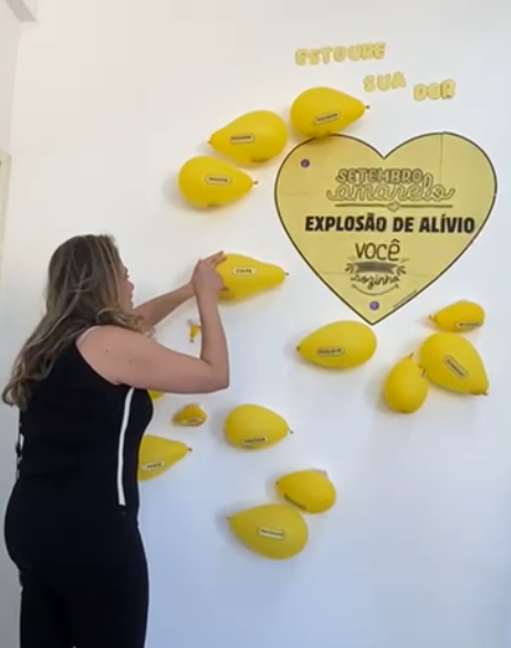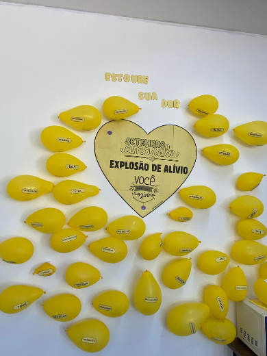 O painel, composto por diversos balões amarelos com palavras como raiva, ansiedade, culpa e desânimo, representava emoções e sentimentos frequentemente reprimidos. Ao estourar o balão que melhor expressava sua dor, cada participante encontrava em seu interior uma mensagem motivacional e doces, como forma de incentivo e leveza.